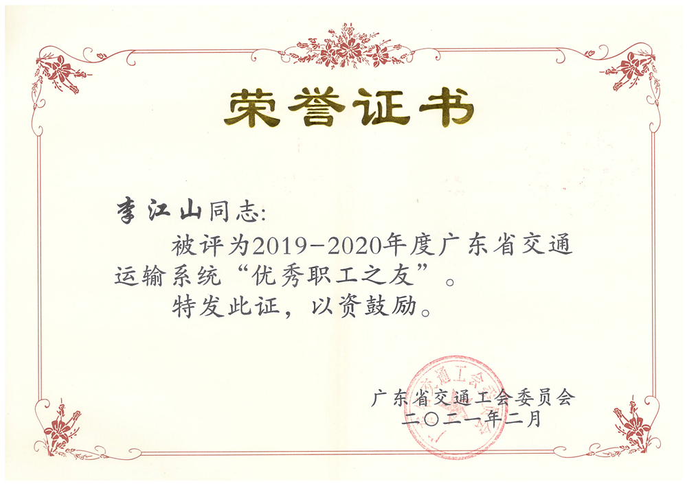 近日,公司工会被广东省交通工会委员会授予2019-2020年度广东省交通运输系统“先进职工之家”荣誉称号;公司董事长李江山同志被评为2019-2020年度广东省交通运输系统“优秀职工之友”,人力资源部主任李玉春同志被评为“优秀女职工”。