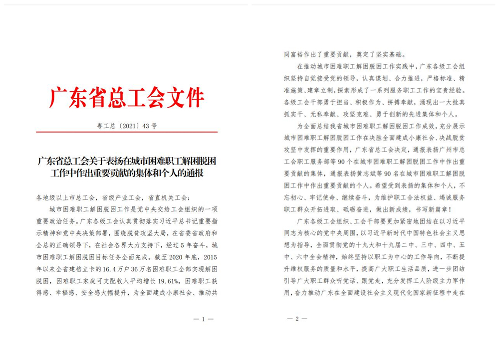 12月20日,广东省总工会以电视电话会议形式召开了全省城市困难职工解困脱困工作总结表彰会。会议总结了五年来全省各级工会推进城市困难职工解困脱困工作取得的重大成就,并表扬了一批在工作中真抓实干、无私奉献、攻坚克难、勇于创新的先进集体和个人。我公司被省总工会授予“在城市困难职工解困脱困工作中作出重要贡献集体”荣誉称号!