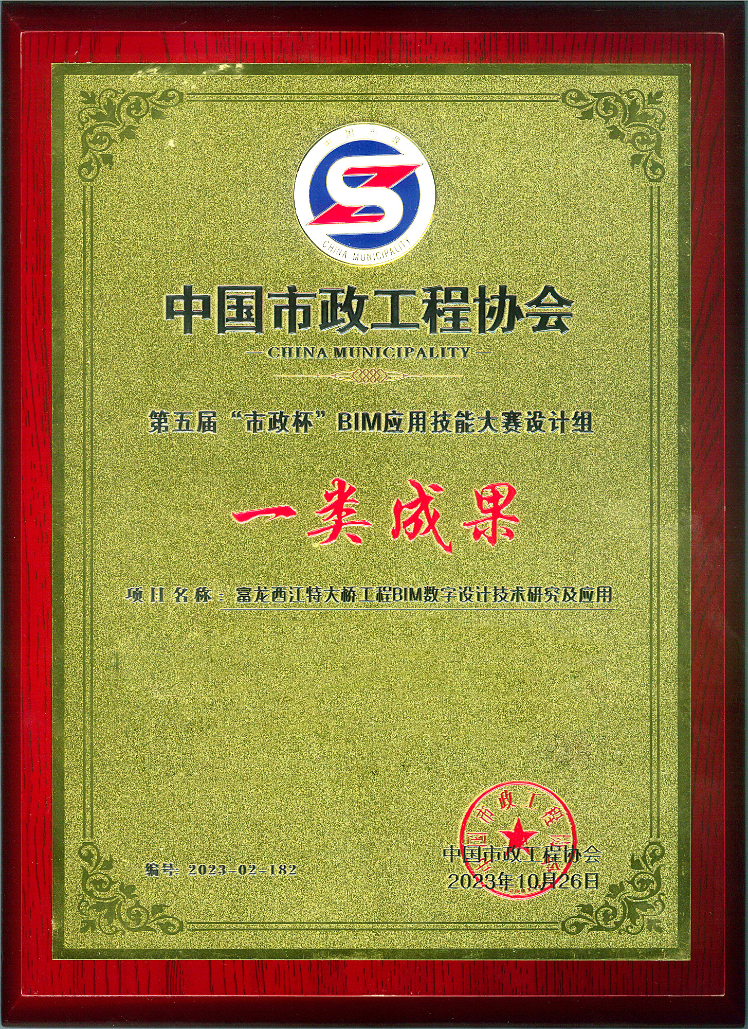 公司《富龙西江特大桥工程BIM数字设计技术研究》荣获中国市政工程协会第五届“市政杯”BIM应用技能大赛一类成果(一等奖)