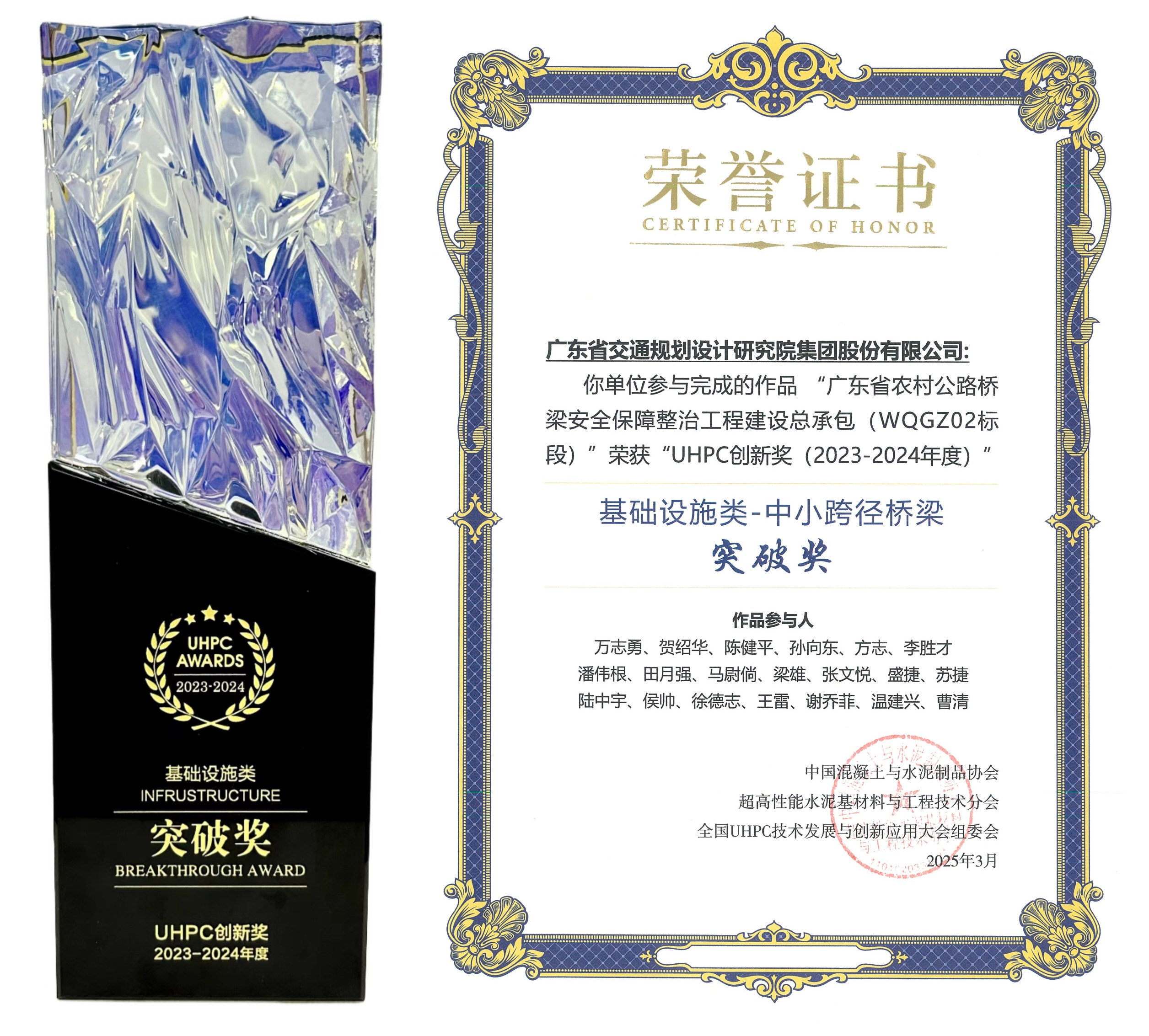 近日,中国混凝土与水泥制品协会超高性能水泥基材料与工程技术分会(简称CCPA-UHPC分会)主办的第二届全国UHPC技术发展和创新应用大会在武汉隆重召开。公司承担的“广东省农村公路桥梁安全保障整治工程建设总承包(WQGZ02标段)”项目荣获大会颁发的“UHPC创新奖(2023-2024年度)基础设施类突破奖”。公司总工程师孙向东、副总工程师万志勇,养护设计院总工程师武建中、副总工程师李胜才等参加了会议及颁奖典礼。