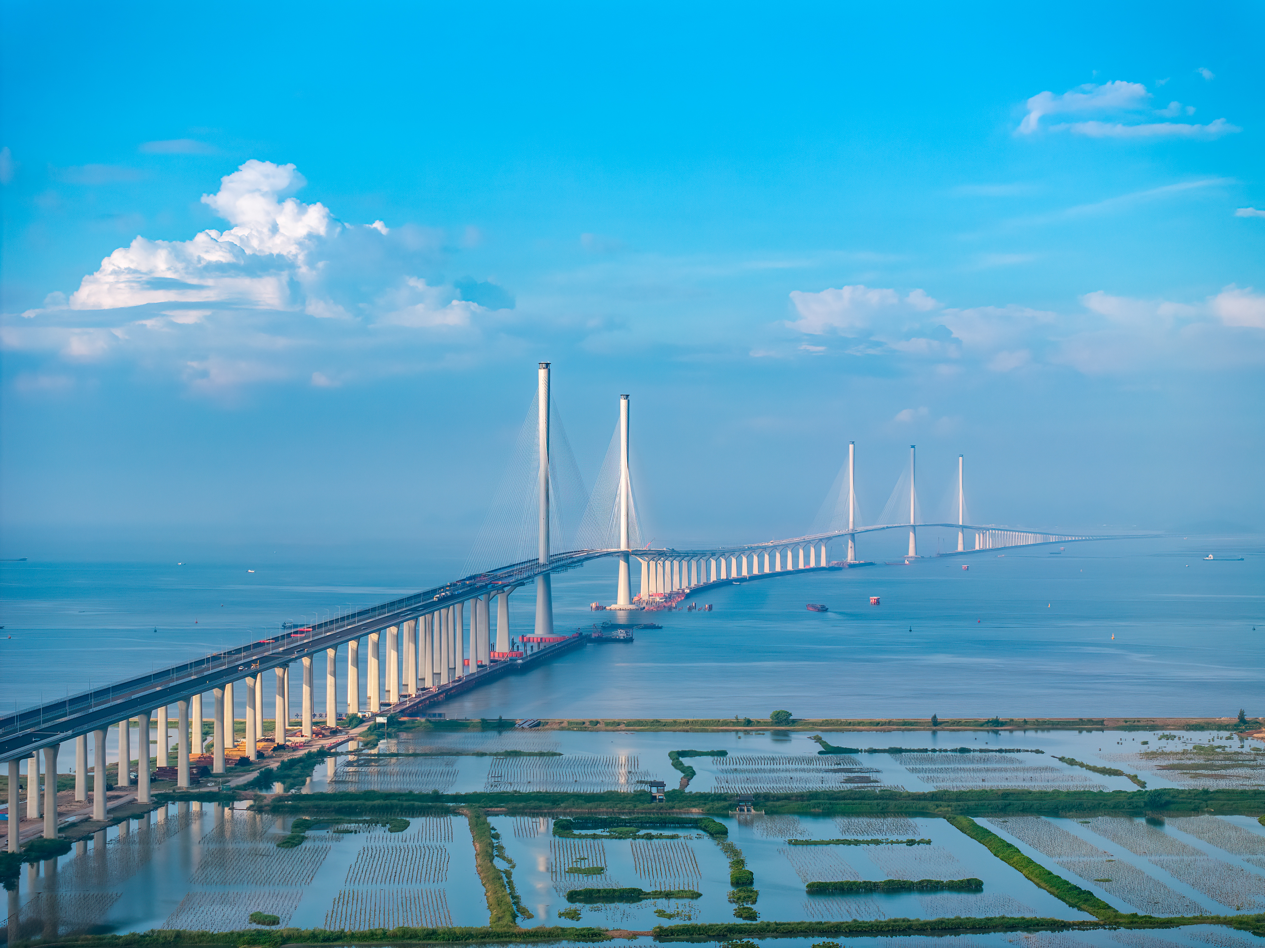 作为粤港澳大湾区的重要基础设施,黄茅海跨海通道不仅加强了区域互联互通、促进了区域协调发展,更树立了桥梁领域的新标杆、新典范,其简洁优雅的设计与自然景观完美融合,形成一道亮丽的风景线,是粤港澳大湾区的标志性建筑之一。