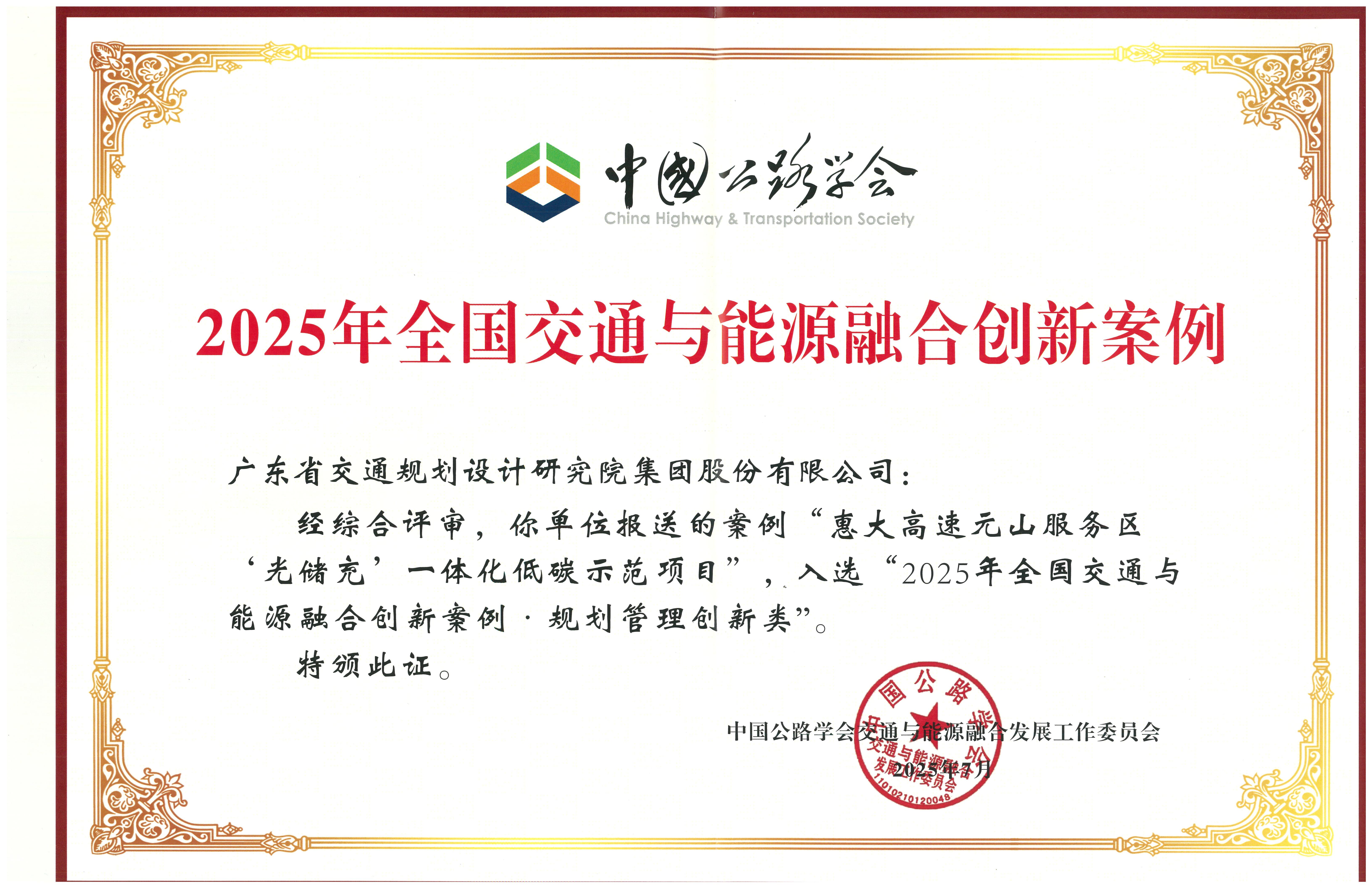 本届年会以“绿色引擎 数智驱动”为主题,共同擘画交通与能源深度融合发展的新蓝图,集中展示我国交能融合领域最前沿的研究成果、实践标杆与权威洞见。会议期间,组委会正式发布了“2025年全国交通与能源融合创新案例集”,此次全国共有64项优秀项目入选,其中公司《广东省交通集团高速公路服务区超级充电站建设规划》《惠大高速元山服务区“光储充”一体化低碳示范项目》《址山服务区光储直柔充电站项目》三个项目入选。