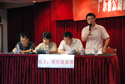 本次辩论赛共分两场,第一场的辩题应时而作,是以抗震救灾为时代背景的“善心与善行,何是真善”,第二场辩题则结合员工发展,直指社会现实,是“在个人与社会之间,个人命运究竟由谁掌握”。选手们就此展开了激烈的辩论,慷慨陈词,滔滔不绝。争先恐后、针锋相对的自由辩论把整个辩论赛推向了高潮。两位“最佳辩手”既在此找到了发挥的空间,更找到了表现的舞台,给评委和观众留下了思维敏捷、语言流利的深刻印象。