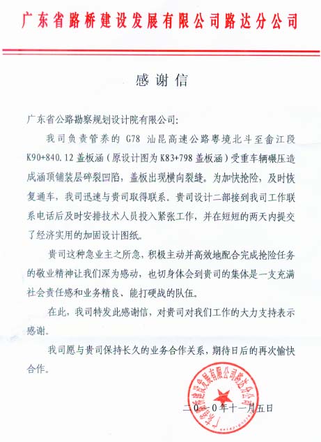 近日,公司收到一封来自业主单位省路桥建设发展有限公司路达分公司的《感谢信》,来信对于我司的高效服务给予了高度赞扬。 不久前,路达公司管养的G78汕昆高速粤境北斗至畲江段K90+840.12盖板涵受重车辆碾压造成涵顶铺装层碎裂凹陷,盖板出现裂缝,为尽快恢复通车,急需加固设计。我司第二路桥设计部在接到此项任务后,第一时间安排技术人员投入紧张工作,并在短短两天提交了令业主满意的经济实用的设计图纸。
