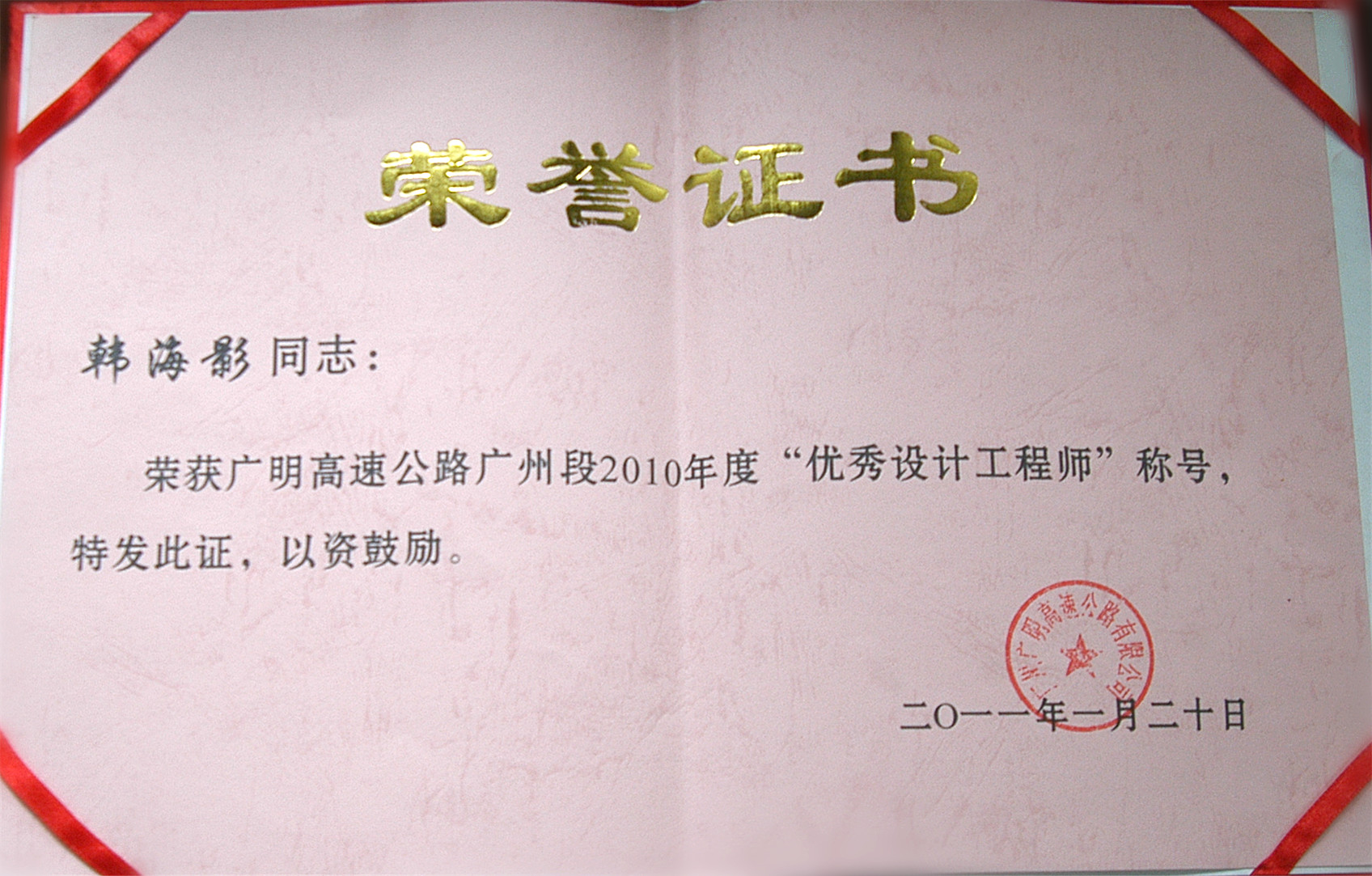 近日,我司第二路桥设计部韩海影同志受到业主单位广州广明高速公路有限公司表彰,荣获广明高速公路广州段2010年度“优秀设计工程师”称号,为公司赢得了良好的声誉,特此祝贺!