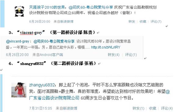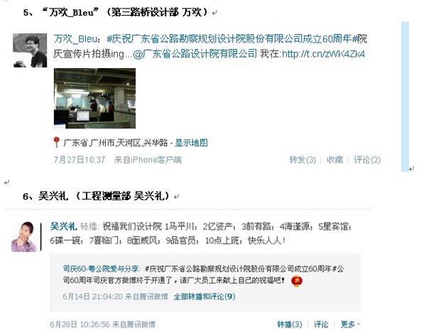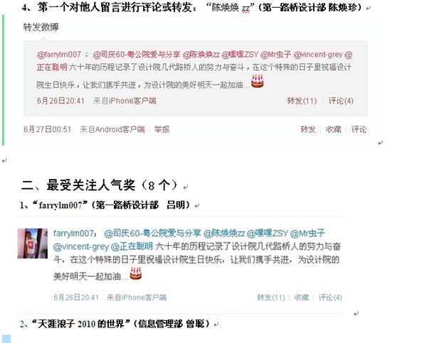近日,公司“司庆微(博)祝福互动”活动获奖名单揭晓,“钓到一条幸福鱼”等12名员工网友荣获“捷足先登奖”、“最受关注人气奖”和“最佳原创奖”等三个奖项。本次活动得到了广大员工网友的热情参与。经过认真甄选,“因为有风2011”、“雷霆救兵”和吴兴礼等3名网友的祝福语在众多的祝福语中脱颖而出,荣获“最佳原创奖”。 “司庆微(博)祝福互动”活动7月31日结束后,公司微博继续保留,适时发布相关资讯。