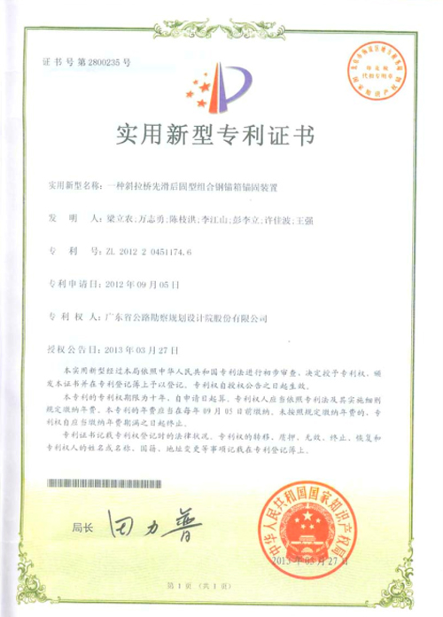 公司研发的“一种斜拉桥先滑后固型组合钢锚箱锚固装置”,于2013年3月27日被中华人民共和国国家知识产权局授予实用新型专利权。