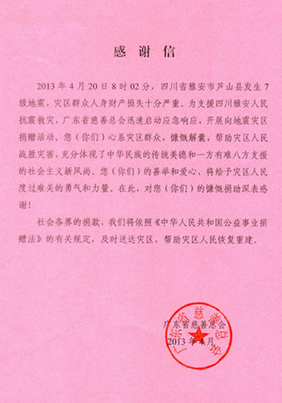 一方有难,八方支援。4月23日上午,为彰显企业必威betway西汉姆联,表达公司对“4.20四川雅安地震”灾区人民的支持,公司向雅安地震灾区同胞捐赠人民币陆万元。捐款已送达省慈善总会,将用于灾民恢复生产、重建家园。