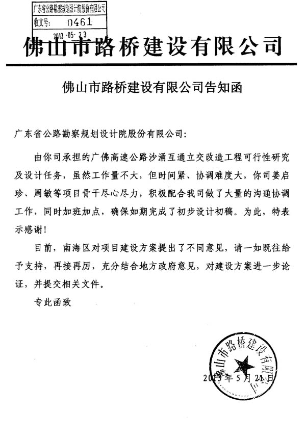 佛山路桥专函表扬公司设计服务工作