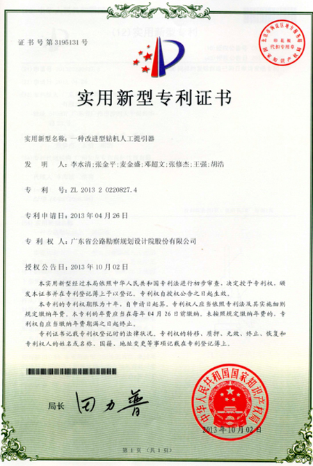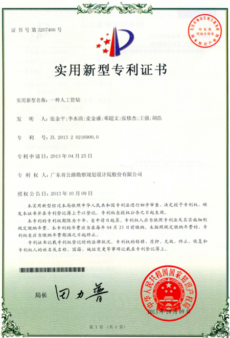勘察分公司研发的“一种改进型钻机人工提引器”和“一种人工管钻”成果,喜获由中华人民共和国国家知识产权局授予的实用新型专利权。