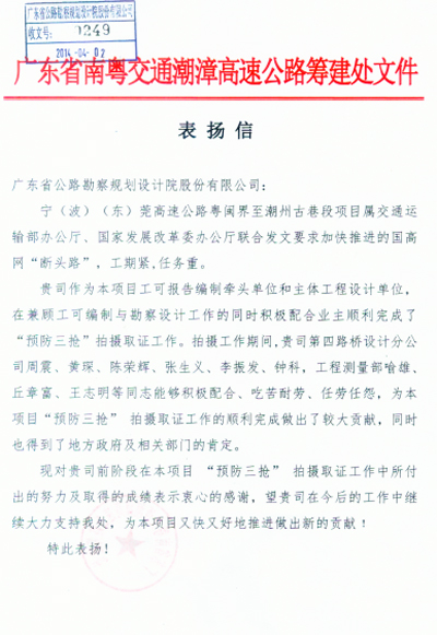 近日,省南粤交通潮漳高速公路筹建处发来表扬信,对我司在该项目“预防三抢”拍摄取证工作中作出的努力表示肯定和感谢。同时,点名表扬了第四路桥设计分公司及工程测量部等一批项目组成员。特此报喜。