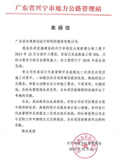 近日,兴宁市地方公路管理站发来表扬信,对我司在兴宁市迎宾大道建设项目中提供的优质、高效的设计后服务表示赞扬,同时对负责该项目的第二路桥设计分公司派驻的设计代表曾昭宇和段银龙同志给予了通报表扬。特此报喜。