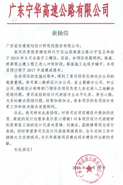 近日,广东宁华高速公路有限公司发来表扬信,对我司在兴宁至汕尾高速公路兴宁至五华段建设项目中提供的优质、高效的设计后服务表示衷心感谢,同时对负责此项目的第二路桥设计分公司、岩土勘察分公司等组织和有关人员给予通报表扬。特此报喜!