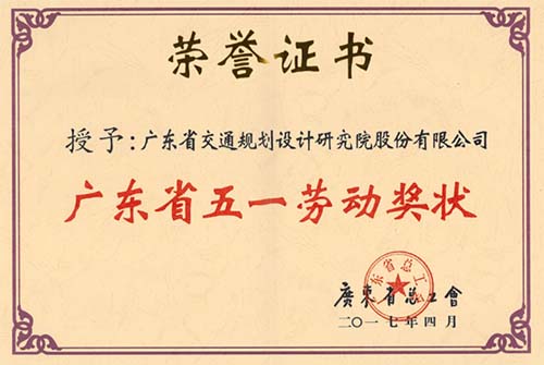 2017年4月27日,在“五一”国际劳动节来临之际,从“2017年广东省庆祝五一国际劳动节暨劳模表彰大会”上传来喜讯——公司凭借其在推进科学发展、体制改革、管理创新和市场开拓等方面的突出表现,经省交通工会推荐,报省总工会评审通过,荣获广东省五一劳动奖状荣誉称号。这是公司首次获此殊荣。