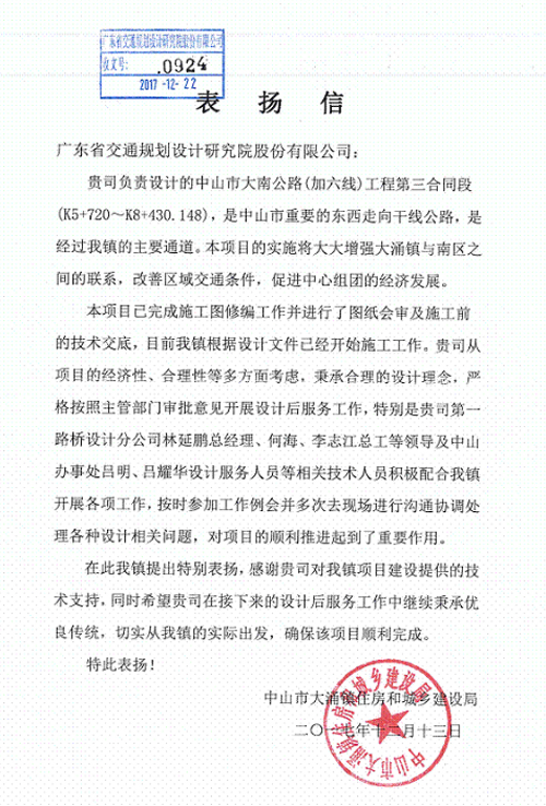 近日,中山市大涌镇住房和城乡建设局发来表扬信,对我司在中山市大南公路(加六线)工程第三合同段中提供优质的设计后服务表示肯定,对负责该项目的第一路桥设计分公司相关负责人林延鹏、何海、李志江,及中山办事处服务人员吕明、吕耀华给予了通报表扬,特此报喜!
