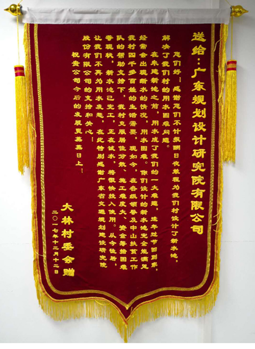 2018年新年伊始,肇庆市封开县金装镇大林村委会送来了一面锦旗,对我公司市政分公司优质高效的完成大林村新水池的设计任务,为当地四千多名老百姓解决了用水难的问题表示由衷的感谢。