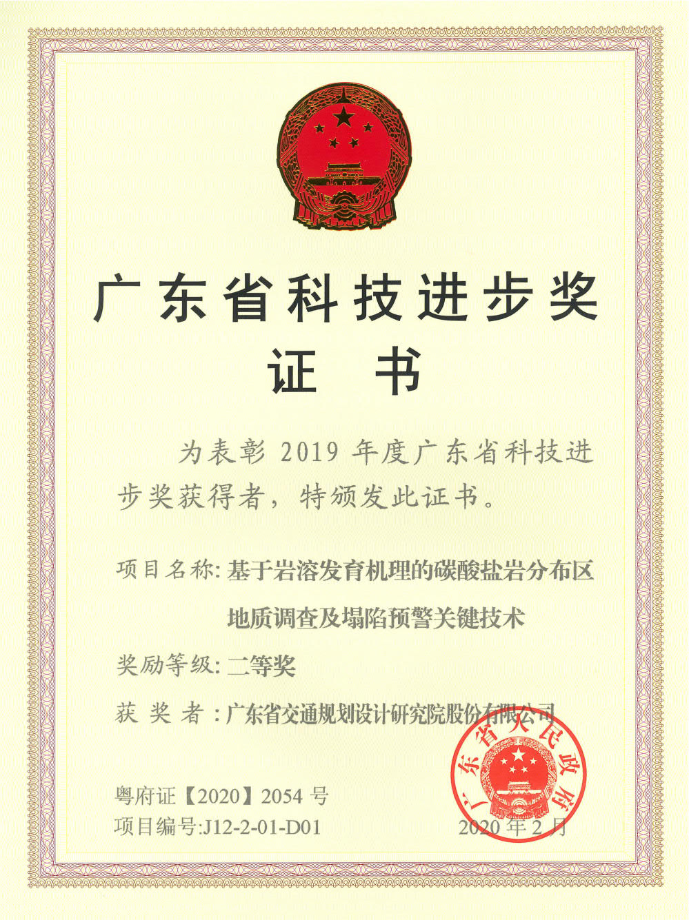 2.“基于岩溶发育机理的碳酸盐岩分布区地质调查及塌陷预警关键技术”荣获广东省科技进步二等奖,承担部门为岩土勘察分院。