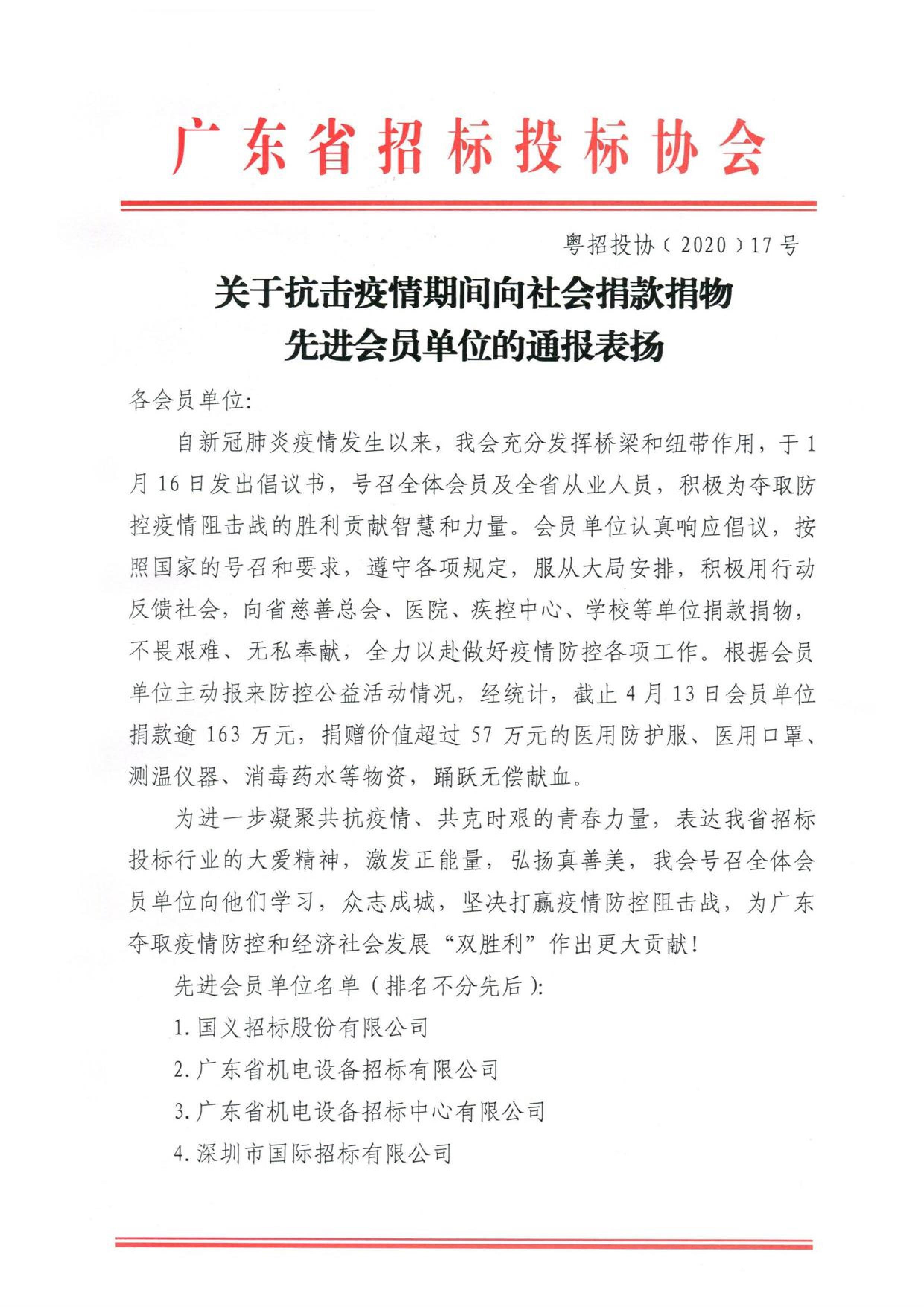 共同战“疫”,奉献爱心,公司获省招标投标协会通报表扬